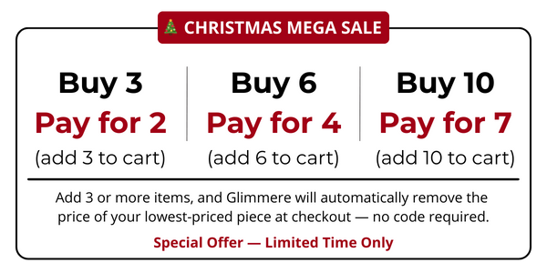 Simply add 3 or more items to your cart, and Glimmere will automatically remove the price of your lowest-priced piece at checkout — no code required.